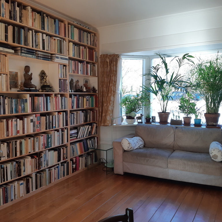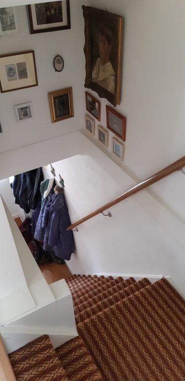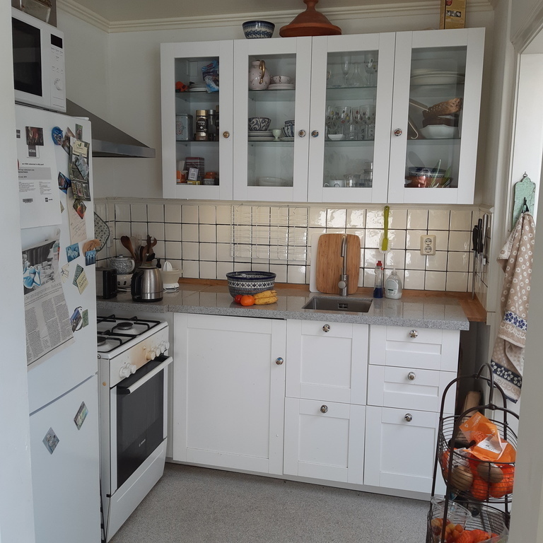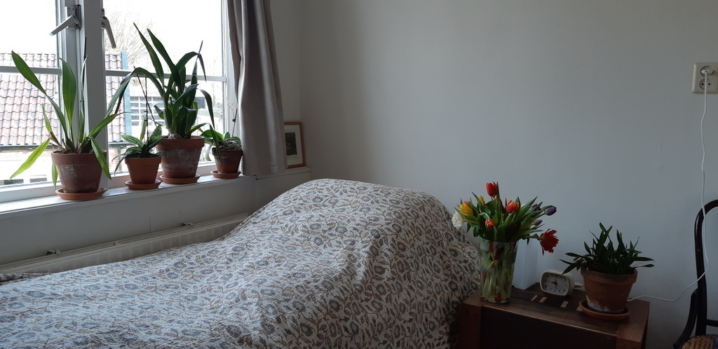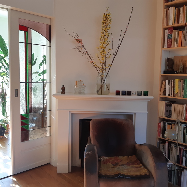 Our house was built in 1935 and still has some authentic details, such as the colourful 'jugendstil' glass sliding doors. Downstairs we have a living room and adjacent conservatory, kitchen and library and a lavatory, upstairs one bedroom with double bed (1.40 m. x 2.00 m.), one with a single bed, a study and a bathroom. We usually keep the study for storing our own personal belongings, to leave more room for you. The rooms are small, but cosy and comfortable.