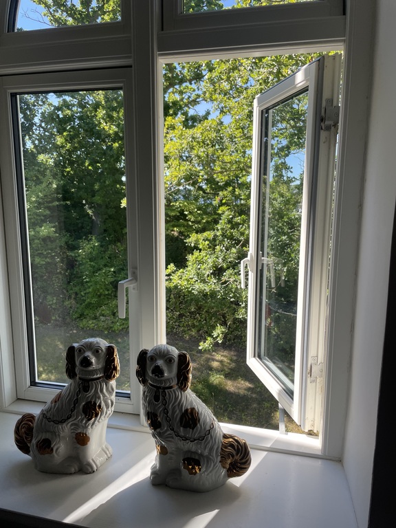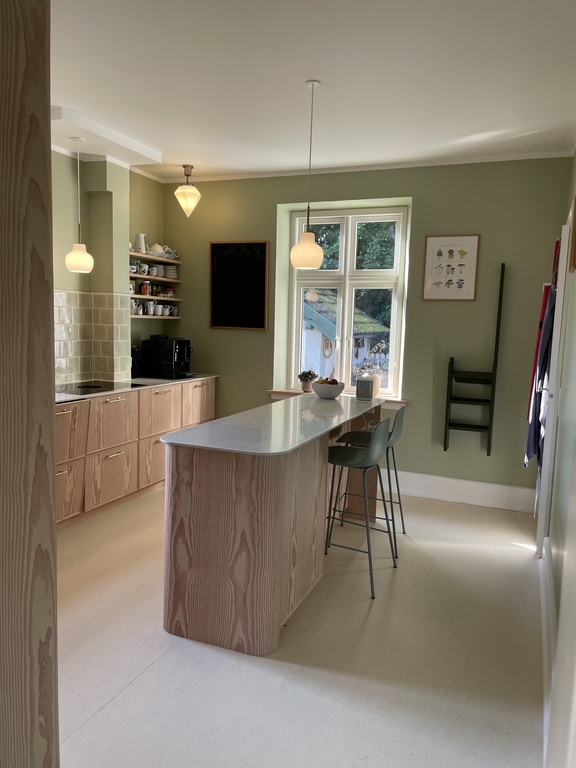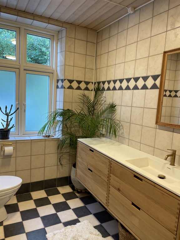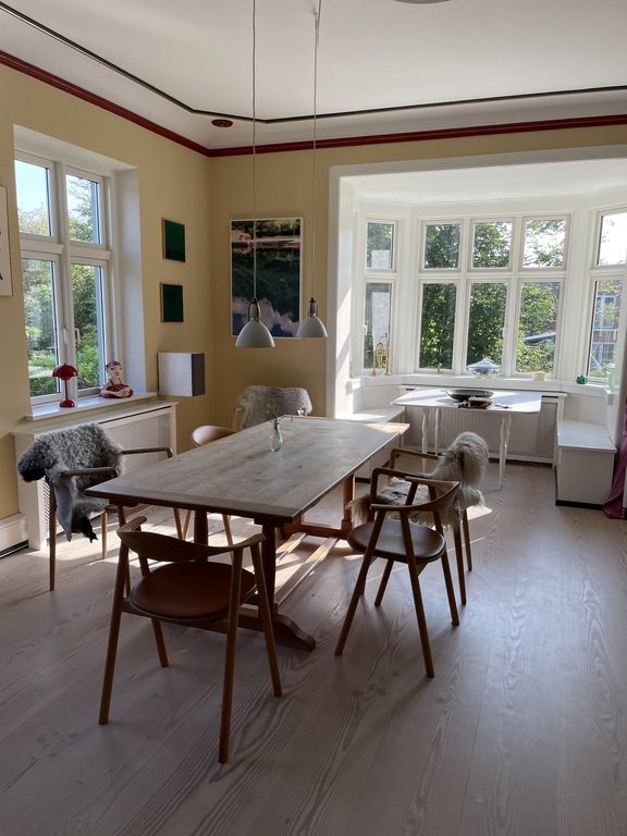 The house is from 1899 and is situated just by the water (Roskilde Fjord) and the recreational area Kalvøen. Still it is close to the town centre and train to Copenhagen. It is 260 m2 with three rooms, bath and kitchen on the first floor and four rooms and bath on the second floor. The garden is app. 2000 m2. There is shade in the trees and outdoor kitchen in the back of the garden, and a lawn, kitchen garden etc in the front. The Fjord is good for fishing.