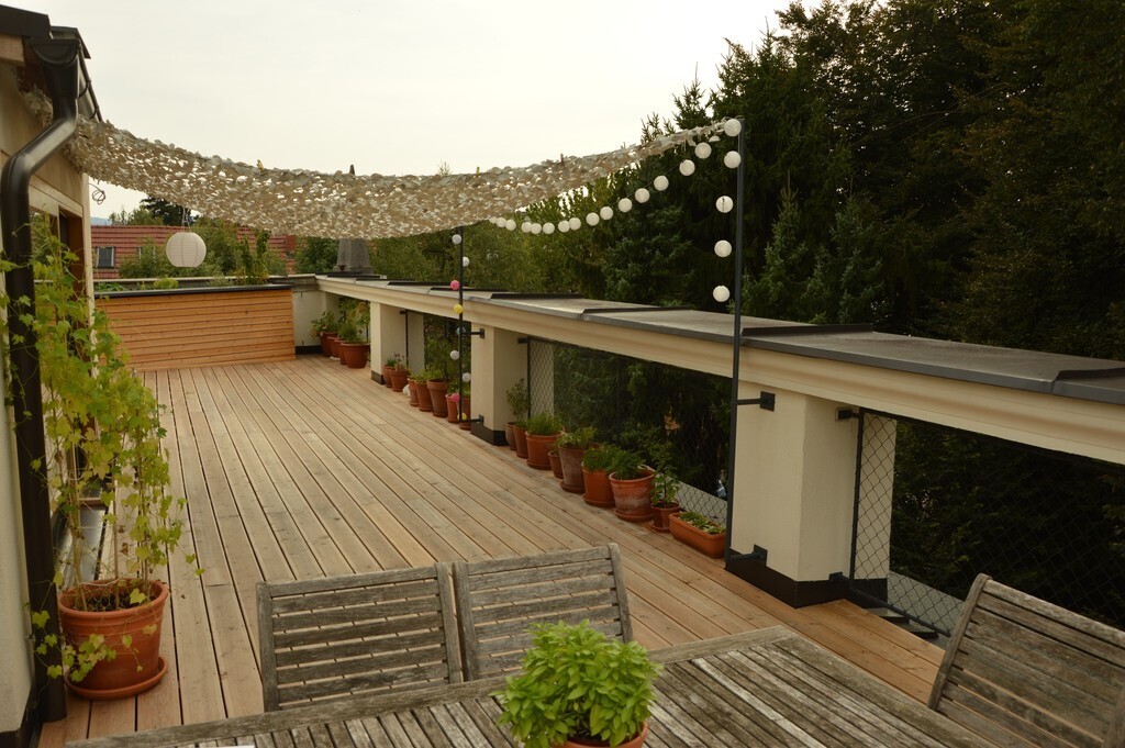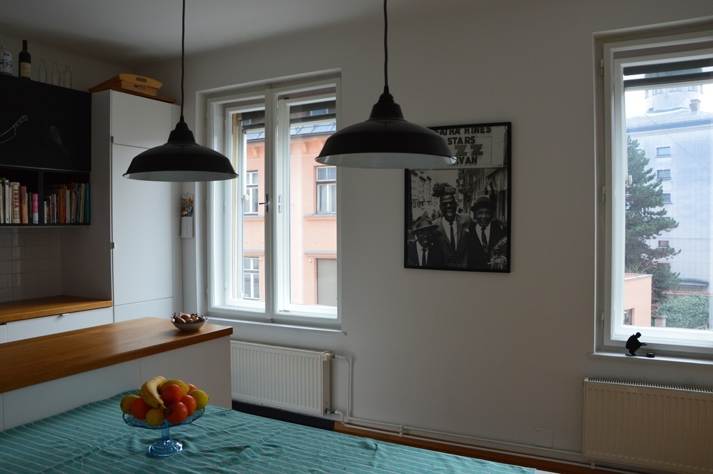 Our home is located on the second and third floor of a house built in the 1930-ies. On the top floor we have a large terrace (80 m2), which is overlooking a small park. On the second floor we have a kitchen/living room/master bedroom (bed size: 140x200 cm). There are two children rooms on the same floor (one of them with a bed size 140x200 cm), a bathroom and a hall/library/staircase. On the third floor we have an extra living room (16,5 m2) leading to the terrace. There is a big TV there with a very good streaming application. The couch there has a good mattress, so the 6th person could sleep there. The terrace is spacious and overlooking a small park.