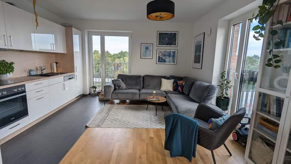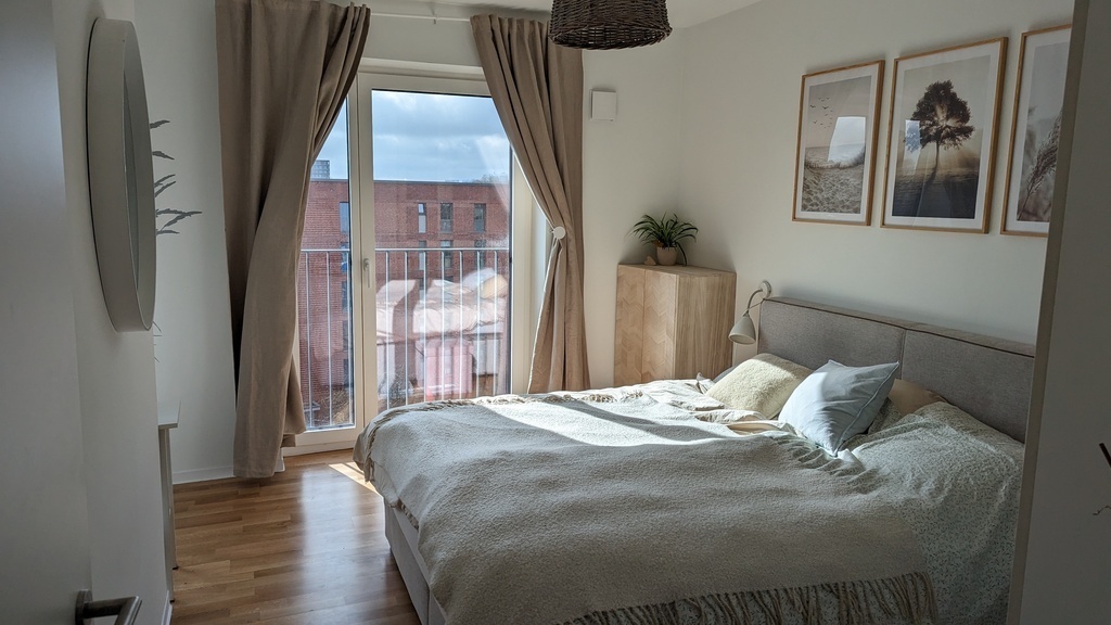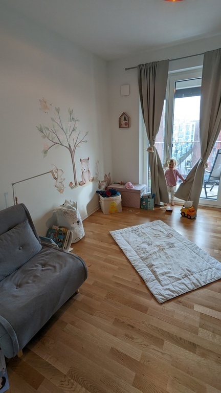 Our apartment (around 80m2) has one bedroom and one child's room. There are two bathrooms and very nice loggia. The apartment is located towards the south so it is very light. We have a cat which needs a bit of care :) we would like to visit some place easy accessible from Hamburg by car +/-5-8 hours.