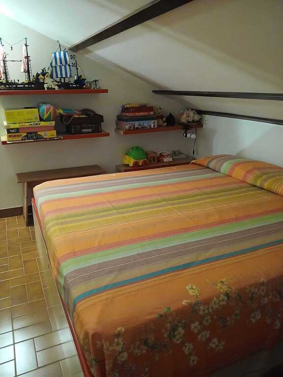 Due livelli, più mansarda. Una camera matrimoniale (letto 160x190 cm) al piano terra. Una seconda camera matrimoniale e 2 letti singoli ( 80x190 cm) al primo piano. In mansarda un terzo letto matrimoniale. Complessivamente, 8 comodi posti letto.