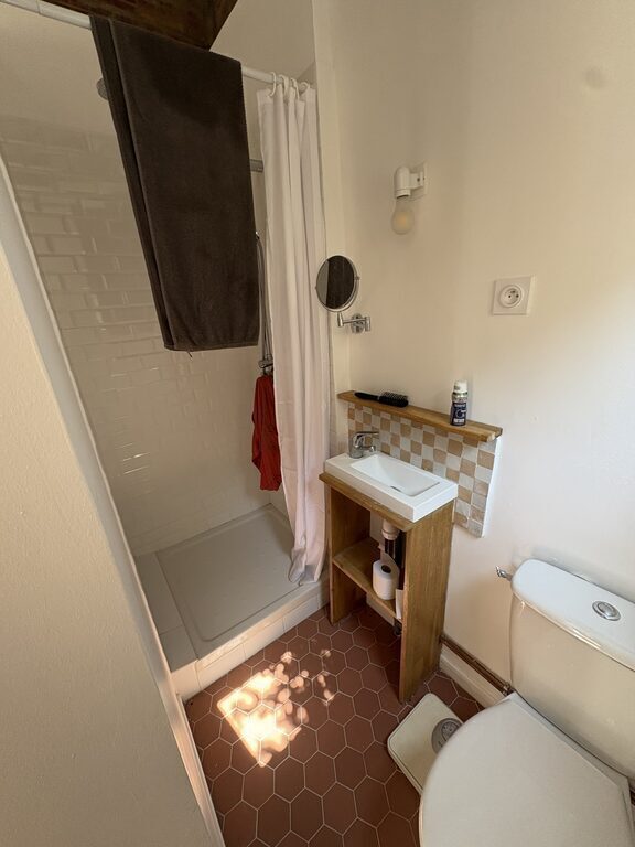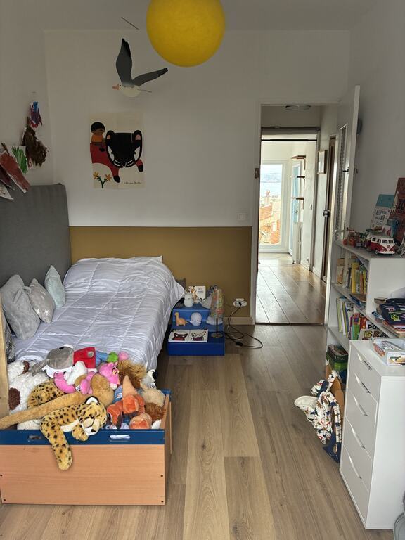 - à l'étage : deux chambres avec un lit double (une chambre avec accès à une terrasse privée de 12 m2, une chambrette avec vue mer donnant sur une terrasse vue mer) ; une chambre d'enfant avec un lit simple ; une salle de bains avec douche et des toilettes indépendantes.