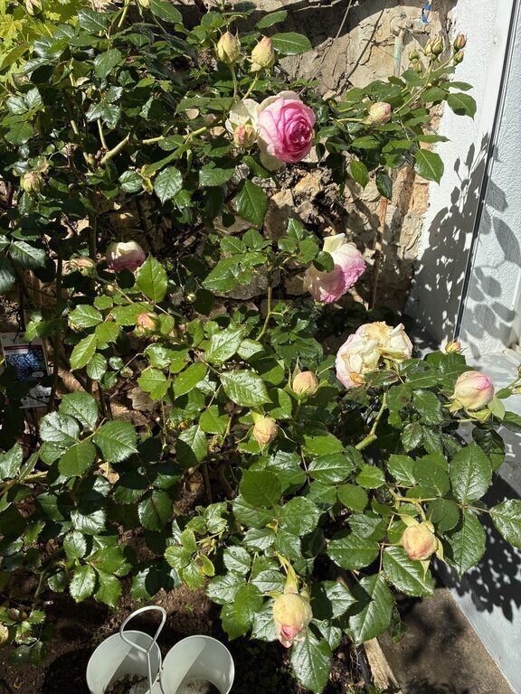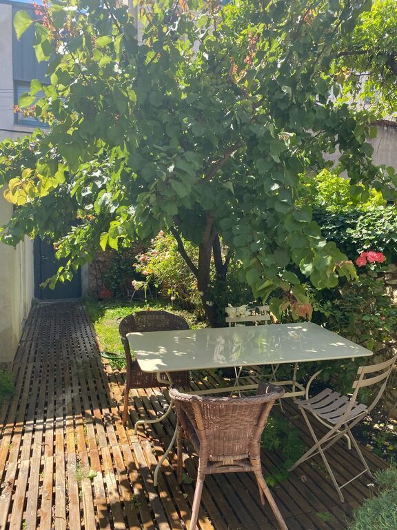 Le jardin est composé de rosiers, d'un abricotier, d’un citronnier, d’aromates et d’un petit potager avec au centre la table pour y manger…