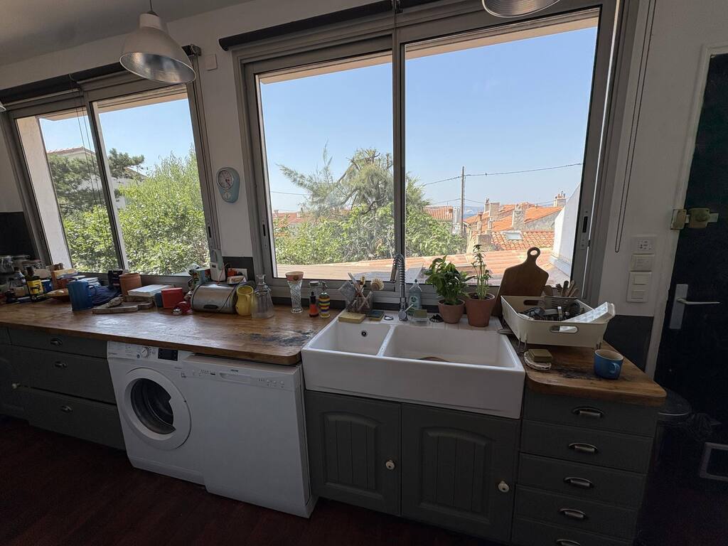 - une cuisine avec de grands baies vitrées donnant sur la mer
