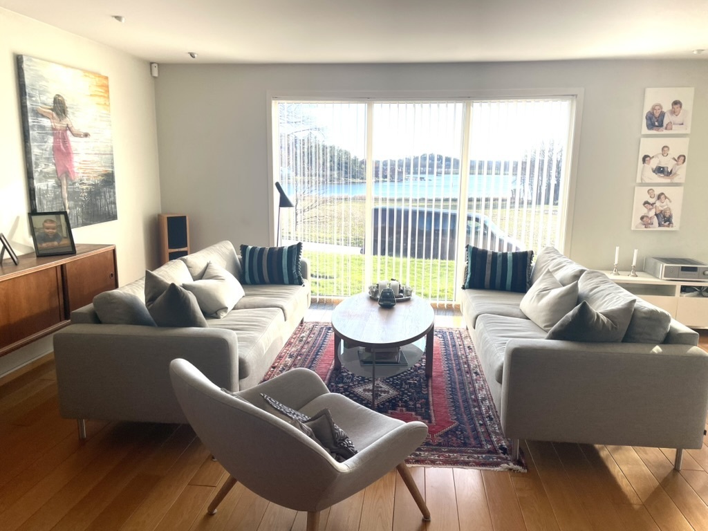 The home also includes practical amenities such as a separate laundry room, a garage, and a full basement. Outdoors, you’ll find large, sheltered seating areas and a beautiful garden that opens toward the surrounding landscape and the sea.