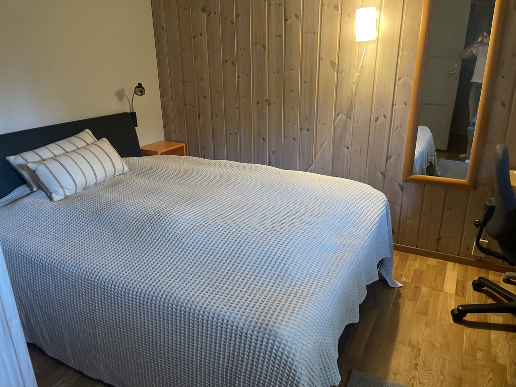 The house has 3 sleeping rooms with double bed, 1 sleeping room with singel bed and there is a double sofa bed in the basement living room.